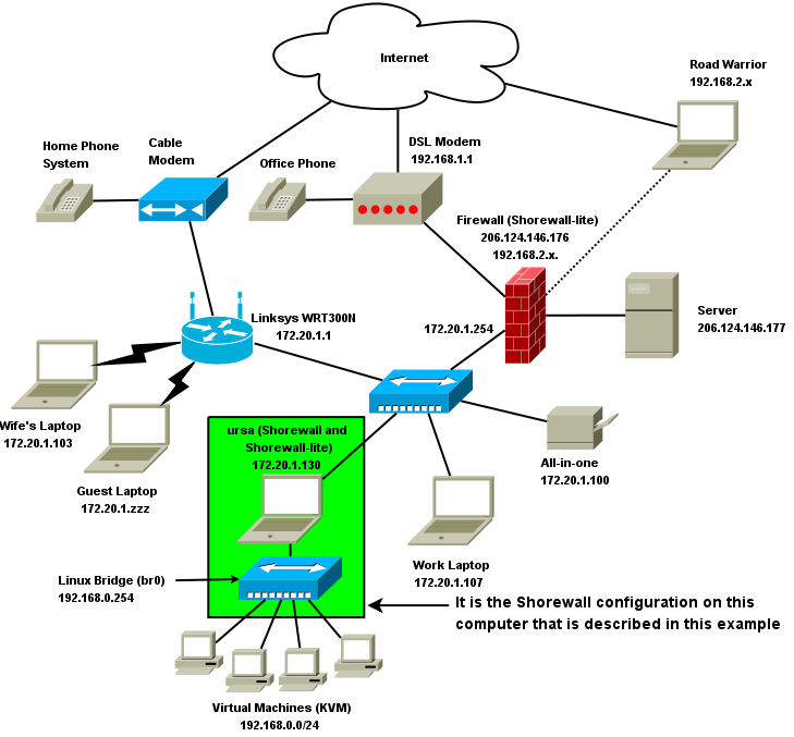 On my personal laptop (ursa), I have 9 virtual machines running various Linux distributions. It is the Shorewall configuration on ursa that I will describe here.