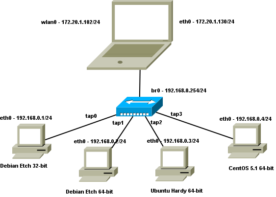 I use KVM to implement a number of virtual machines running various Linux Distributions. The following diagram shows the entire network.