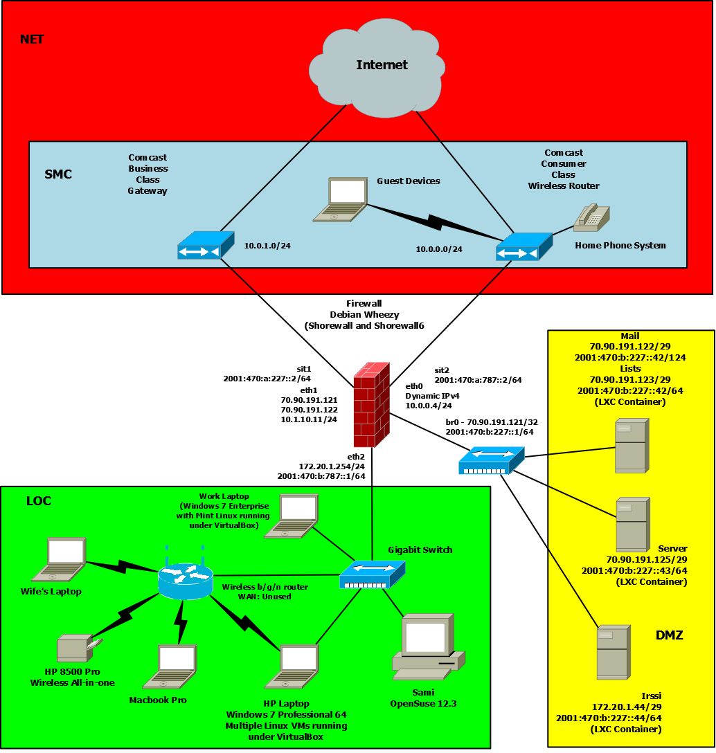 A DMZ hosting a two servers (one has two public IP addresses - one for receiving email and one for sending) and a system dedicaed to running irssi (usually via IPv6)
