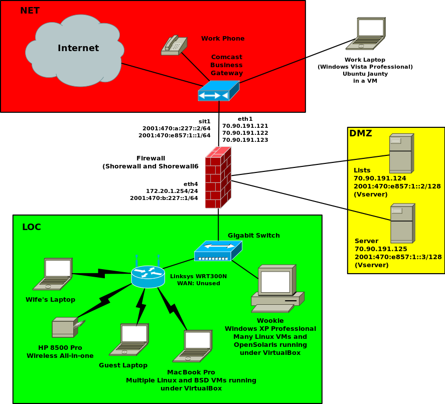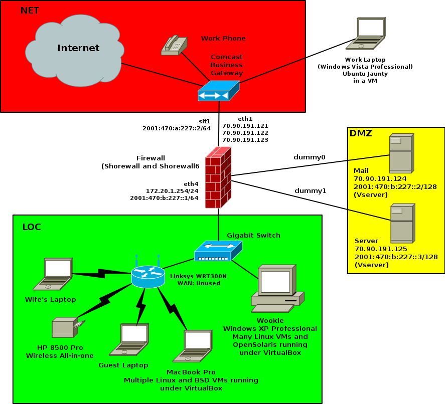 This is a diagram of the network configuration here at Shorewall.net during the summer of 2010: