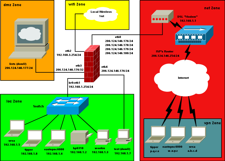 In Dom0, I run a conventional three-interface firewall with Proxy ARP DMZ -- it is very similar to the firewall described in the Shorewall Setup Guide with the exception that I've added a fourth interface for our wireless network. The firewall runs a routed OpenVPN server to provide road warrior access for our three laptops and a bridged OpenVPN server for the wireless network in our home. Here is the firewall's view of the network: