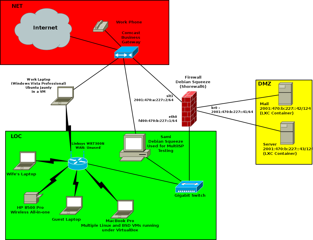 Because of the limitations of IPv6 NETMAP (no Netfilter helpers), the servers in the DMZ have public addresses in the block 2001:470:b:227::/112. The local LAN uses the private network fd00:470:b:227::/64 with the hosts autoconfigured using radvd. This block is allocated from the range (fc00::/7) reserved for Unique Local Addresses.