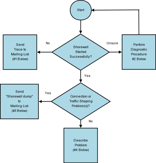 If Shorewall is starting successfully and your problem is that some set of connections to/from or through your firewall isn't working (examples: local systems can't access the Internet, you can't send email through the firewall, you can't surf the web from the firewall, connections that you are certain should be rejected are mysteriously accepted, etc.) or you are having problems with traffic shaping then please perform the following six steps: