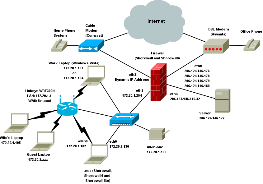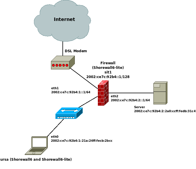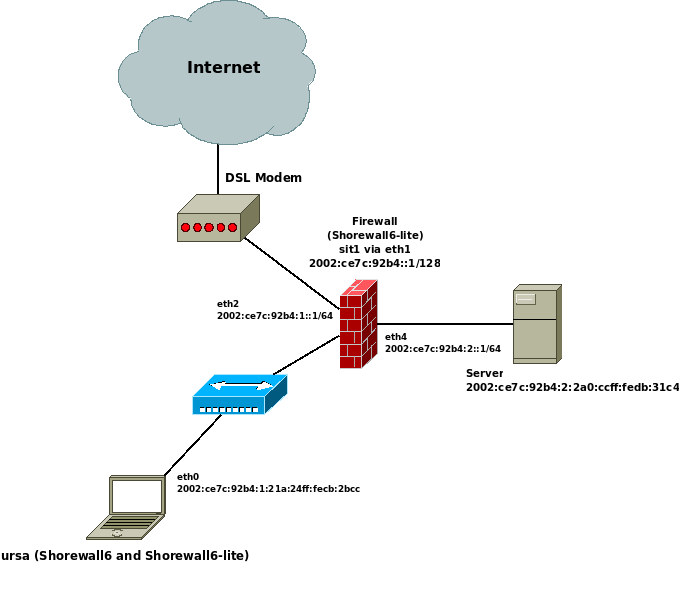 6to4 tunnels provide a good way to introduce yourself to IPv6. Shorewall6 was developed on a network whose only IPv6 connectivity was an 6to4 Tunnel; that network is described in the remainder of this section. What is shown here requires Shorewall6 4.2.4 or later.