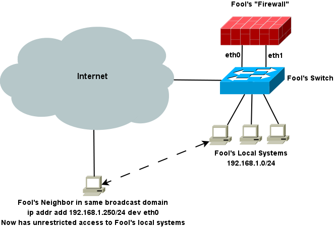 Occasionally, we hear from someone who has cabled his firewall's external and internal firewall interfaces to the same unmanaged switch (or mis-configured managed switch). I call this configuration The Fool's Firewall.