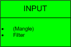 The above box gives the name of the built-in chain (INPUT) along with the names of the tables (Mangle and Filter) that the chain exists in and in the order that the chains are traversed. The above sample indicates that packets go first through the INPUT chain of the Mangle table then through the INPUT chain of the Filter table. When a chain is enclosed in parentheses, Shorewall does not use the named chain (INPUT) in that table (Mangle).