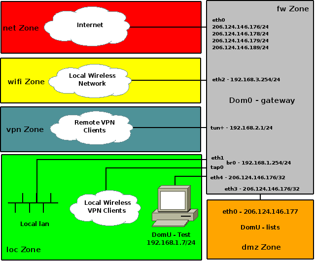 As the developer of Shorewall, I have enough experience to be very comfortable with Linux networking and Shorewall/iptables. I arrived at this configuration after a fair amount of trial and error experimentation (see Xen and the art of Consolidation). If you are a Linux networking novice, I recommend that you do not attempt a configuration like this one for your first Shorewall installation. You are very likely to frustrate both yourself and the Shorewall support team. Rather I suggest that you start with something simple like a standalone installation in a DomU; once you are comfortable with that then you will be ready to try something more substantial.